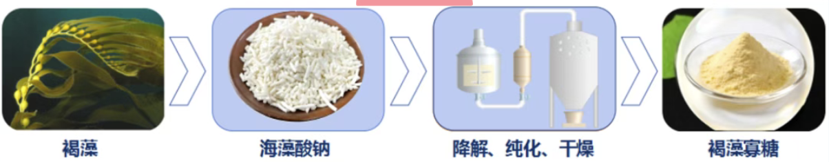 褐藻寡糖是以褐藻来源的海藻酸钠为原料,经过酸溶解、高温降解、中和、脱色、纯化、浓缩、干燥等工艺制得的褐藻寡糖,是聚合度为2~10 的饱和低聚糖。它是国家卫生健康委员会正式批准的国家新食品原料,标志着我国在海洋生物活性物质开发领域迈出了关键一步。